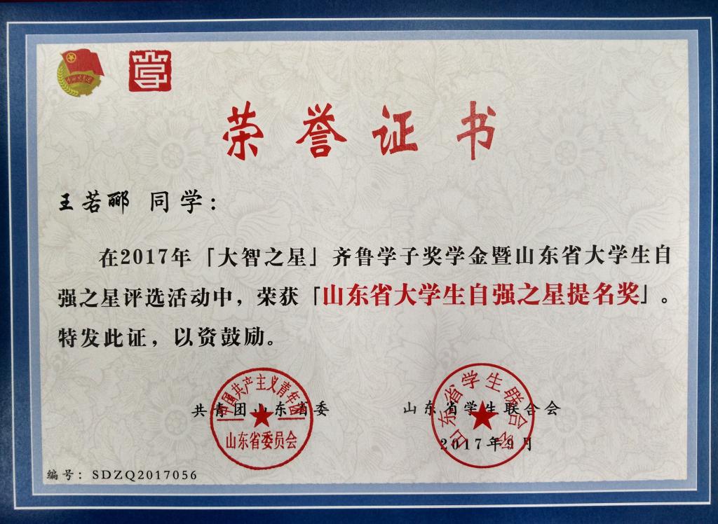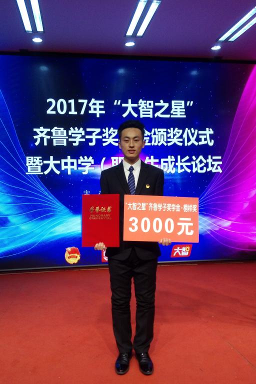 近日,2017“大智之星”齐鲁学子奖学金暨山东省大学生自强之星评选活动结果公布,365英国上市网站官网机电工程学院机械工程(机械制造及其自动化)2014级2班宋宏祥同学荣获齐鲁学子榜样奖学金,被授予“山东省大学生自强之星标兵”称号,经济与管理学院财务管理2015级1班王若郦同学荣获“山东省大学生自强之星提名奖”。
