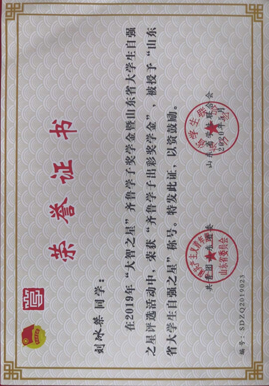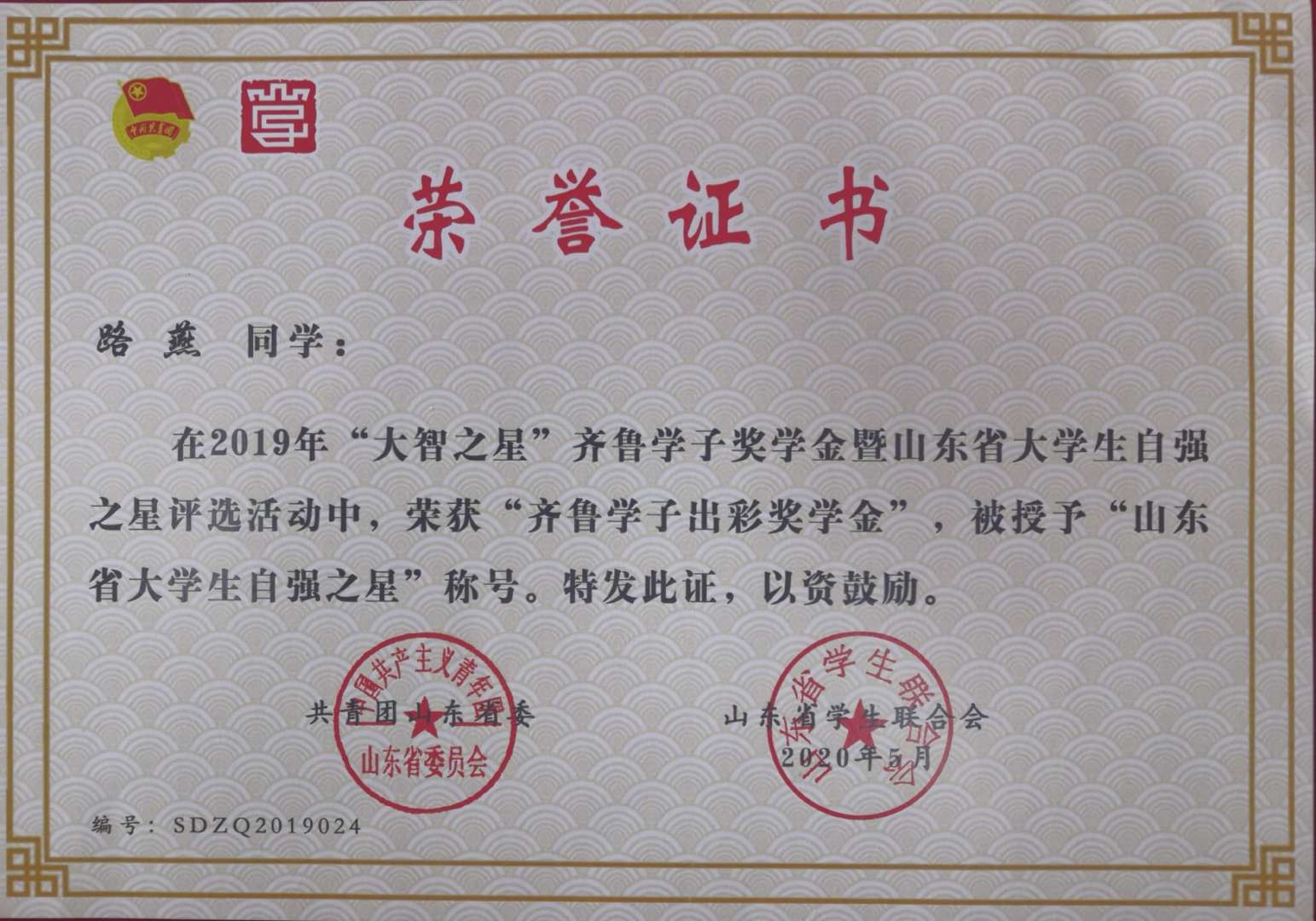 青科大青年学子获评2019年“大智之星”齐鲁学子奖学金