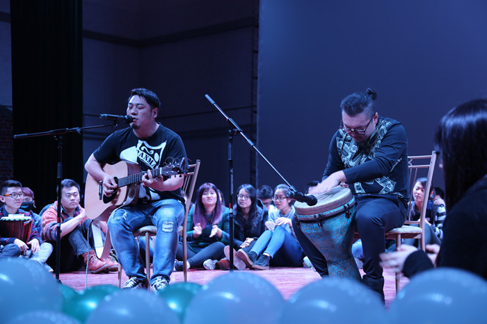 伴随着热烈的掌声,大冰的团队成员王继阳上台,以一曲激昂的蒙古歌曲,感染了现场观众,悠扬的歌声,仿佛来自辽阔的大草原,悠远空旷。小猫的故事在那一声声的呼唤中深情款款,而与妈妈的故事则温暖了在场每一观众的心灵。他演奏的《大山里的孩子》、《唱给自己的歌》更是深深地打动了现场的观众。大冰的团队成员老谢给现场观众来带浓浓的沧桑感,他雄厚有力的歌声响彻礼堂,用倾情演唱讲述那些“忽晴忽雨的江湖,愿你有梦为马,随处可栖。既可朝九晚五,又可浪迹天涯”的故事,将唱聊会现场氛围推向了高潮。