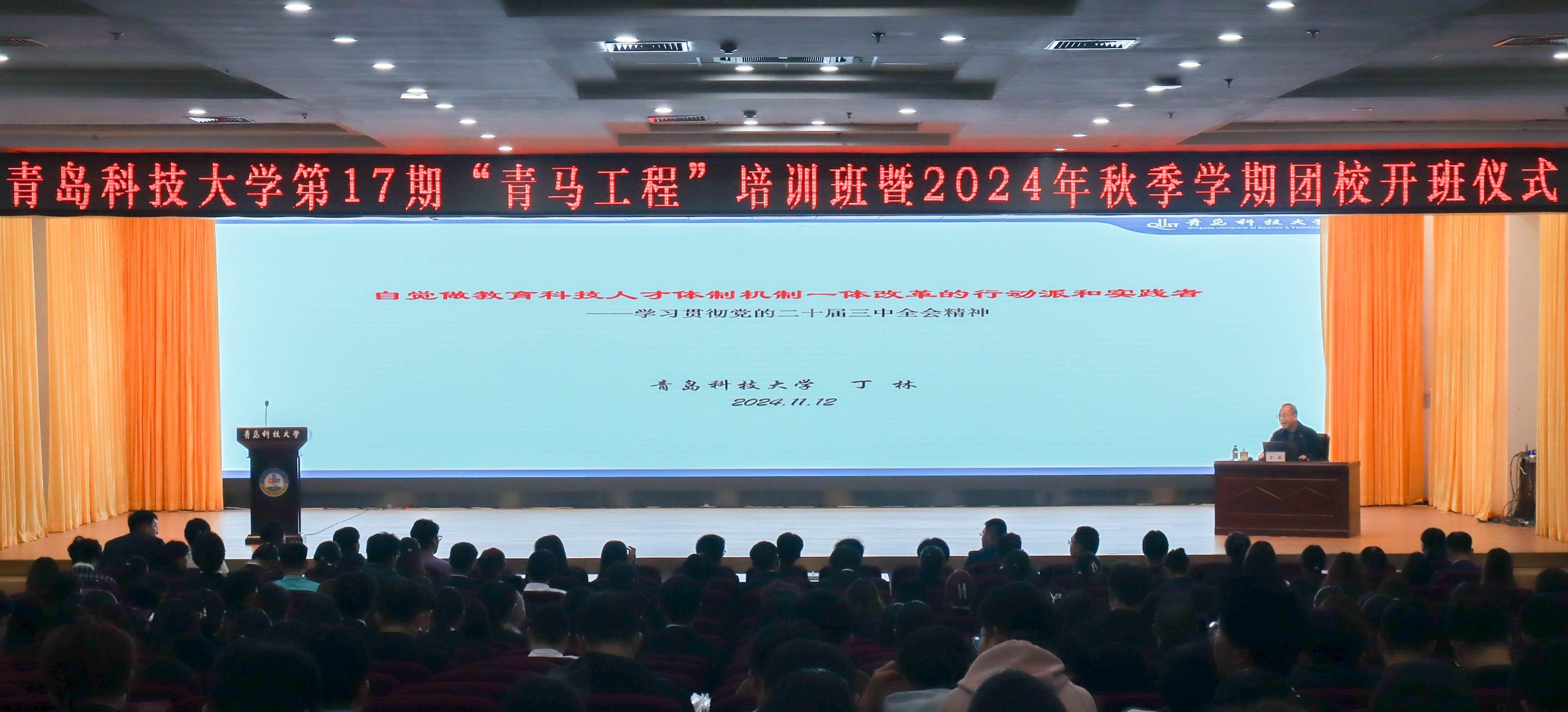 11月12日下午,学校第17期“青年马克思主义者培养工程”培训班开班仪式在崂山校区第二报告厅举行,党委常委、副校长丁林,党委常委、宣传部部长张洪坤出席仪式。