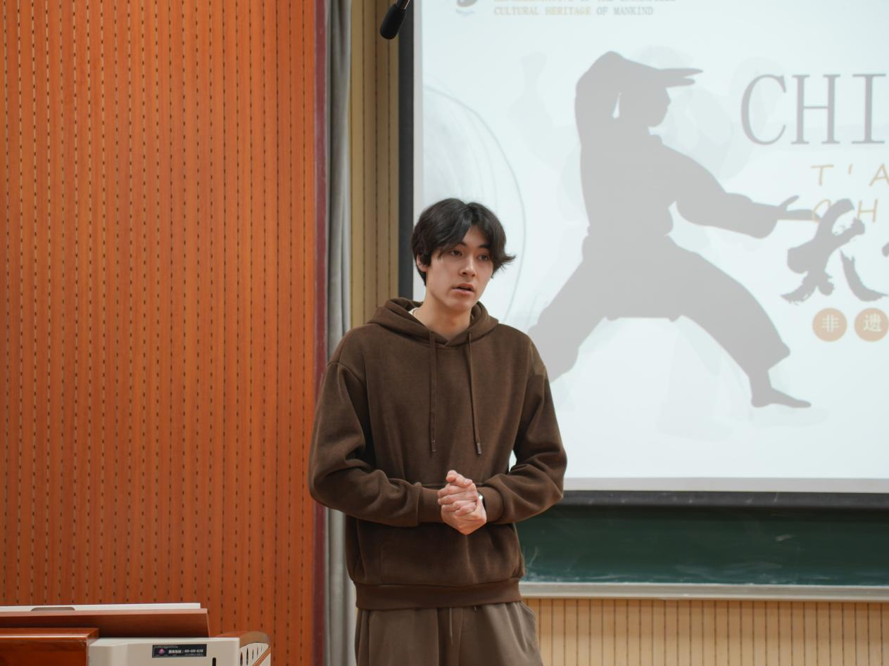 首先,罗雁月同学向外国留学生们介绍太极拳的历史渊源和文化内涵。接着,弈剑阁成员示范太极拳的基本动作,现场教学太极动作。成员们把太极拳刚柔并济的特点展现得淋漓尽致,为外国留学生们呈现一场蕴含深厚中国文化底蕴的视觉盛宴,赢得热烈掌声。