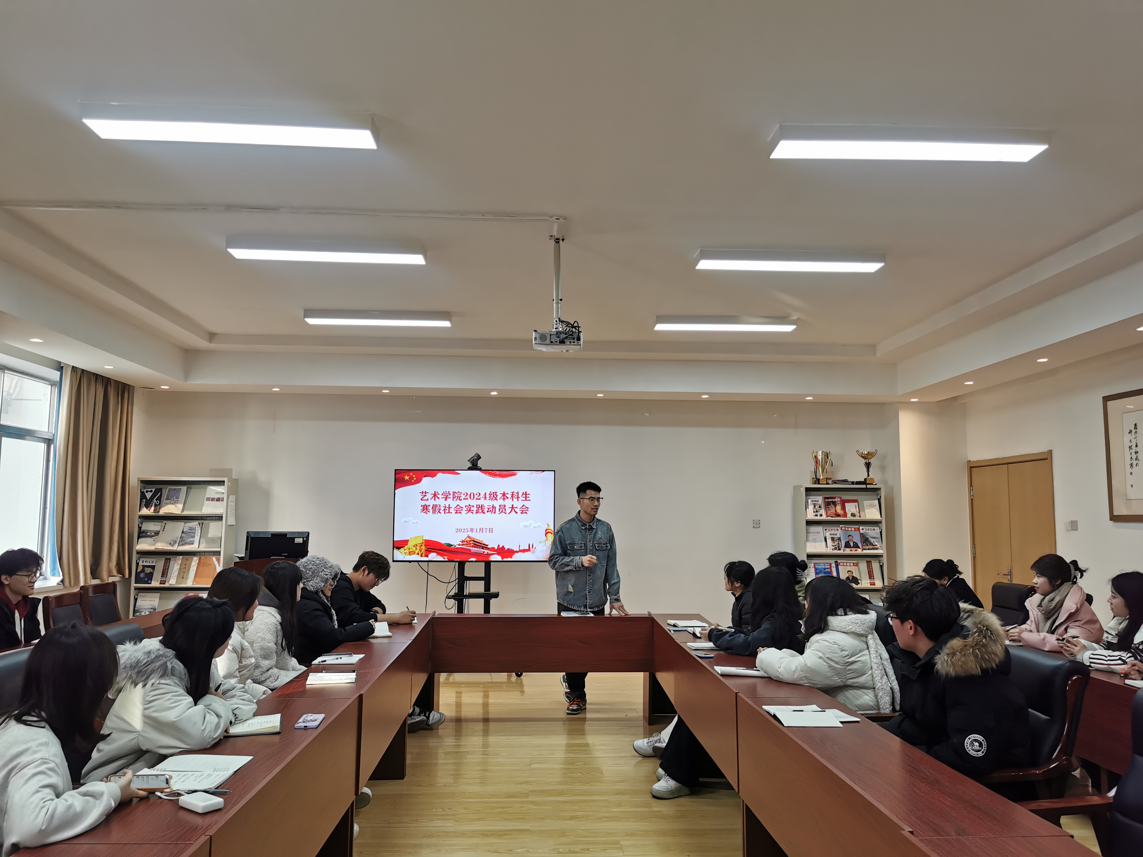 为深入学习宣传贯彻党的二十大和二十届三中全会精神,全面贯彻习近平新时代中国特色社会主义思想,引导和帮助青年学生在社会课堂中受教育、长才干、作贡献。1月7日,艺术学院2025年寒假社会实践动员会于213会议室顺利召开。本次会议由辅导员杨橙主持,2024级学生代表参会。